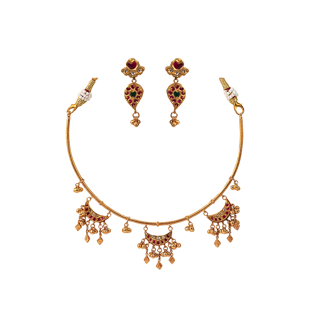 A lightweight Hasli necklace with mini crescent charms, classic kemp stones, and soft bead danglers. Paired with clean, minimal earrings, this set is perfect for Gen Z who love gold but want pieces that feel fresh and wearable.